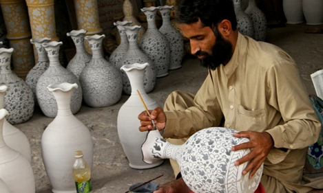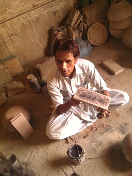 (একজন কাশিগার মৃৎশিল্পে নকশা আঁকছেন)